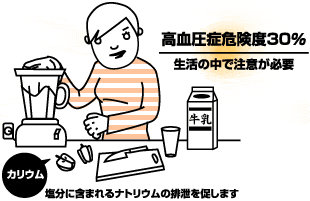 初期の高血圧症の対処としては、定期的な運動、食事療法などの自己管理が必要です。日常生活の中では積極的に「動く・歩く」という身体活動を実行しましょう。また、食物繊維をたくさん摂るようにし、肉よりは魚類を食べるようにするとよいでしょう。また、緑黄色野菜や果物に含まれるカリウムは、塩分の中で血圧に影響するナトリウムの排泄をよくしてくれるので、多めに摂るようにしましょう。イライラすると血圧を上げることにつながるので、ストレスをためずにゆったりとした気持ちで日常を過ごすことも大切です。