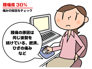 腰痛の原因は、同じ姿勢を続けていること、肥満、ひざの痛みなど。慢性の腰痛症は、年代ごとにその原因が異なることもあります。椎間板ヘルニア、ぎっくり腰、脊椎分離症、骨粗しょう症などが原因のことも多いので、ひどくなるようなら、専門医に相談してみましょう。