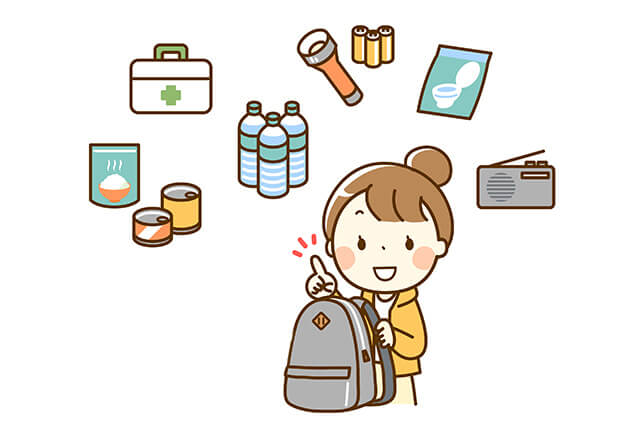 子どももある程度の荷物を背負って歩けるようになったら、専用の防災リュックを用意しましょう。それも防災教育の一環になりますし、その子が必要とする物を入れておけば、万が一迷子になった時にも安心です。そして普段のお出かけ時から、水、おやつ、着替え、おもちゃを入れたリュックを自分で持つ練習をさせてみてください。
